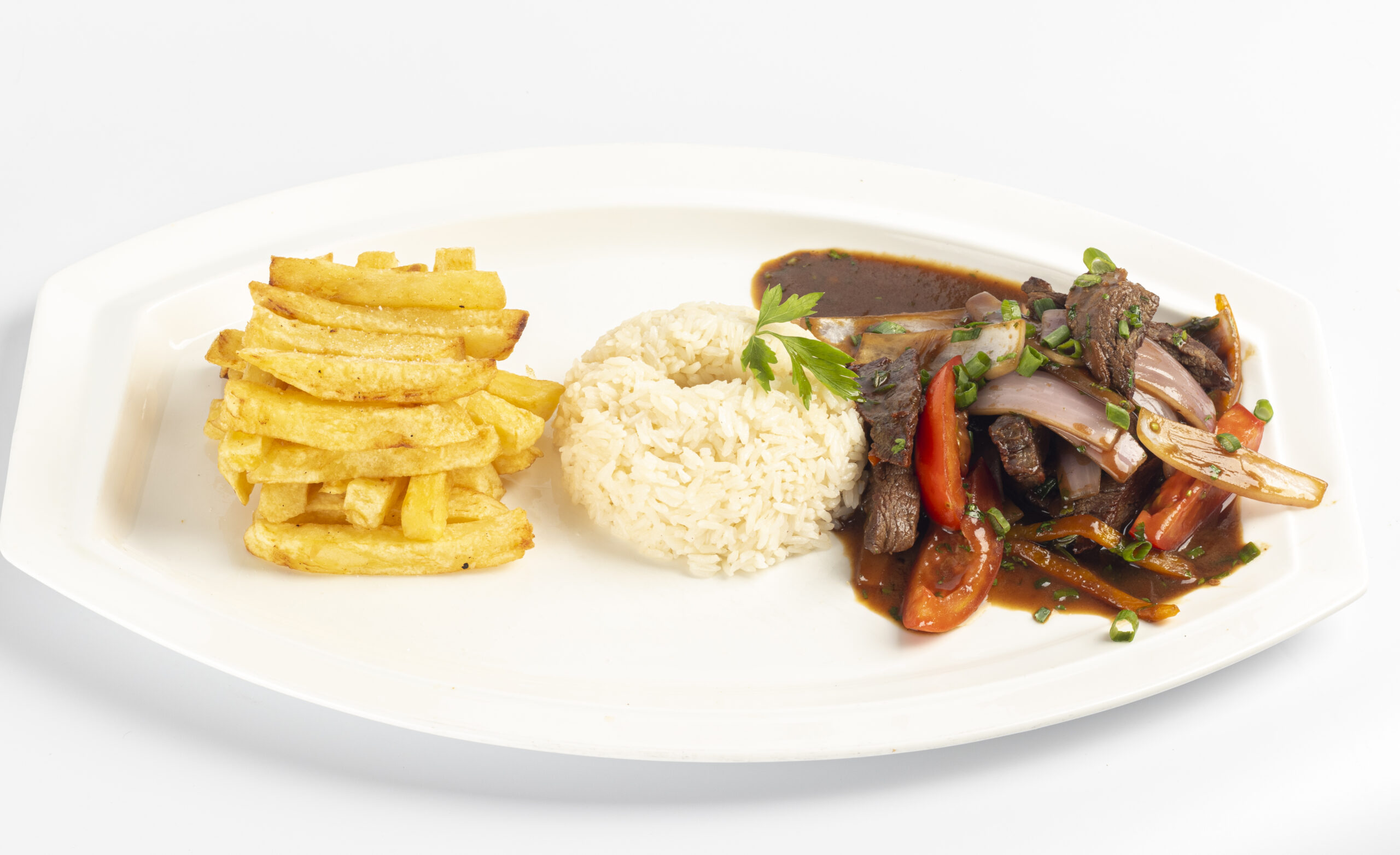 TROZOS DE CARNE DE LOMO FINO FLAMEADOS AL WOK CON CEBOLLA, TOMATE, SALSA DE SOYA, SERVIDO CON PAPA FRITAS Y ARROZ